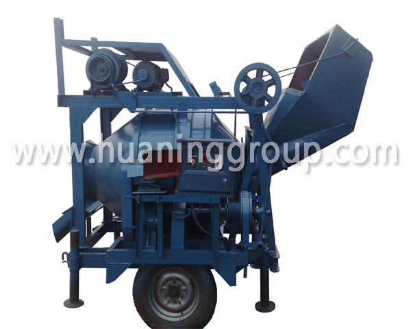 It discharges concrete with the double wimble rotating anticlockwise, while it mixes the materials by rotating clockwise. The mixing drum is driven by gear ring.