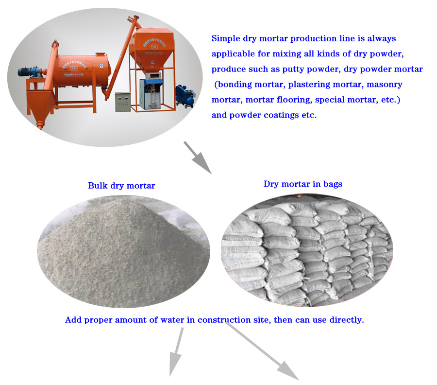 Dry mortar production line is mainly composed of dry mortar mixer, feed screw conveyor, three ribbon mixing machine, secondary hoist, a storage hopper and automatic packing machine, etc.. This system is an efficiency production system after multiple times improvement on the basis of multiple ribbons dry mortar mixer. Mixed product will be into a storage bin through second lift machine. Then worker can carry out filing operation and not affect the next production. Matching an accurate packing machine can greatly improve production efficiency.